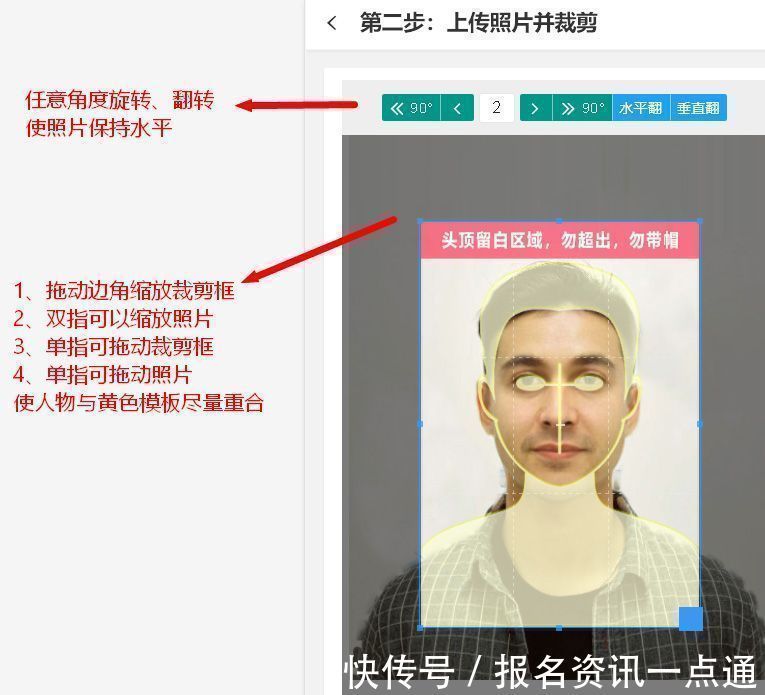上传准备好的照片,支持任意尺寸证件照、生活照、自拍照,但不建议使用翻拍照片,按照提供的证件照人像模板进行裁剪
